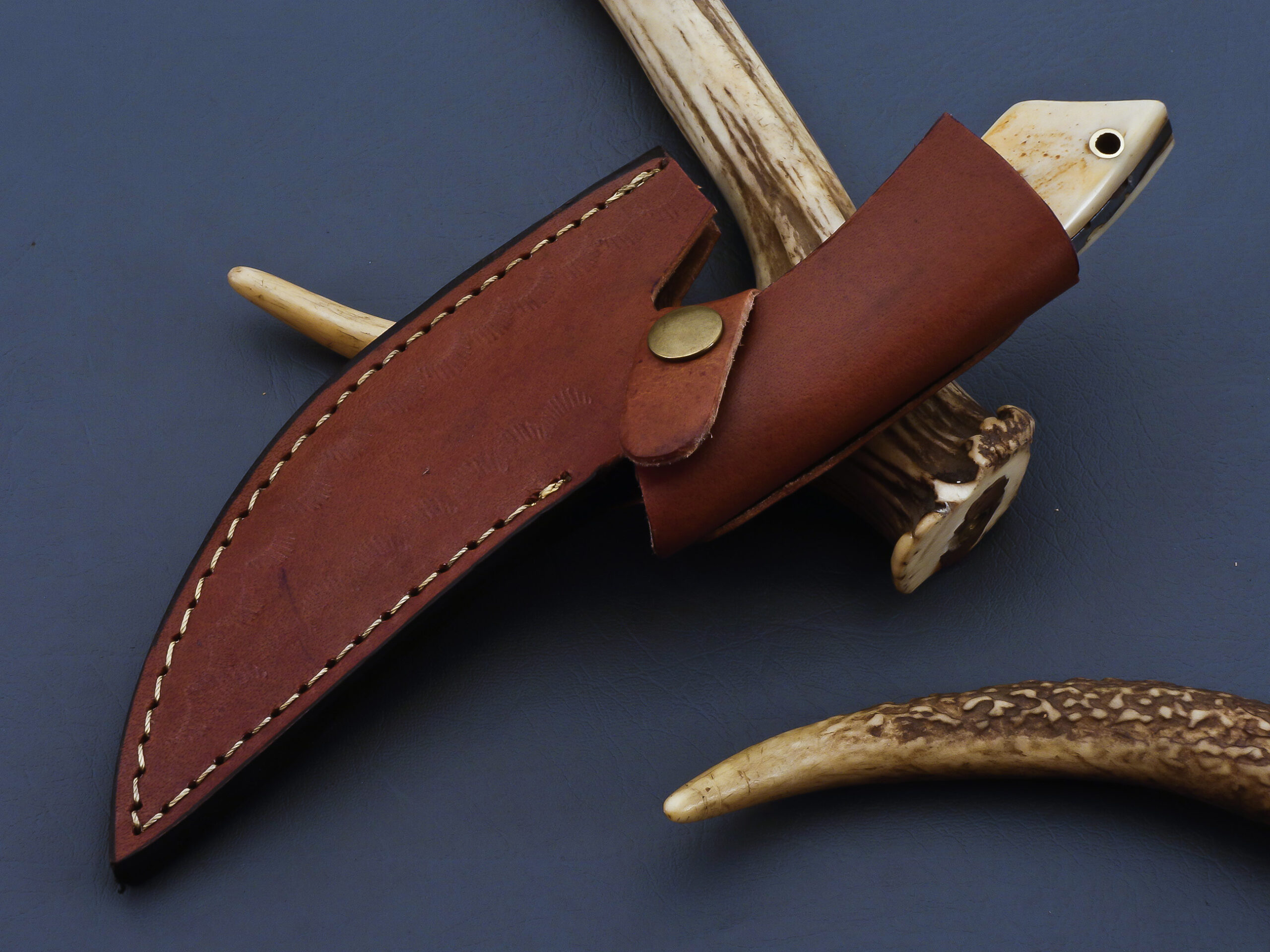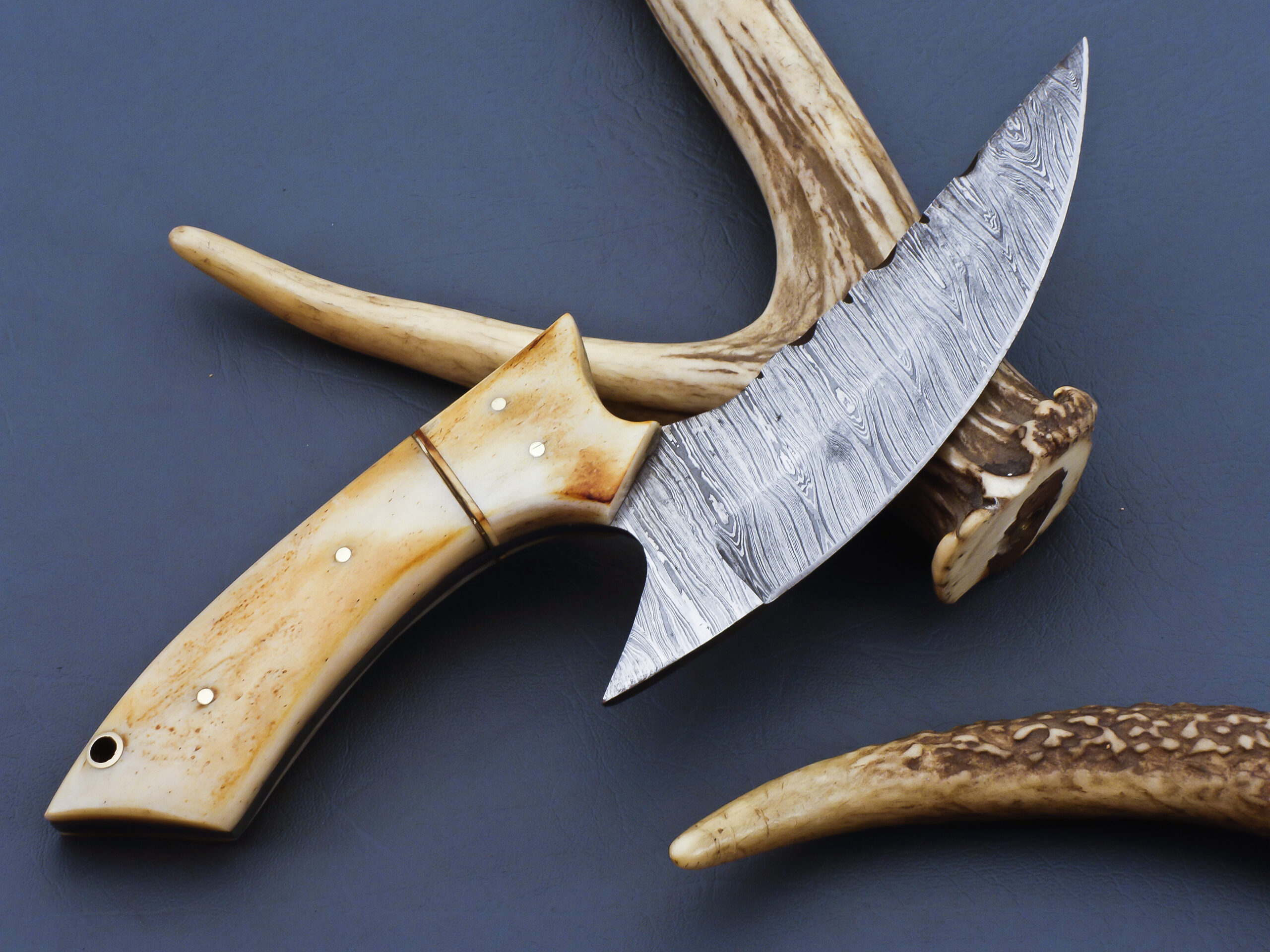 Crafted for collectors and outdoor enthusiasts, this Damascus steel hunting knife combines traditional artistry with rugged functionality. Featuring a polished bone handle and a finely patterned Damascus blade, it’s both a tool and a statement piece. Complete with a hand-stitched leather sheath, this knife is built to impress and endure.