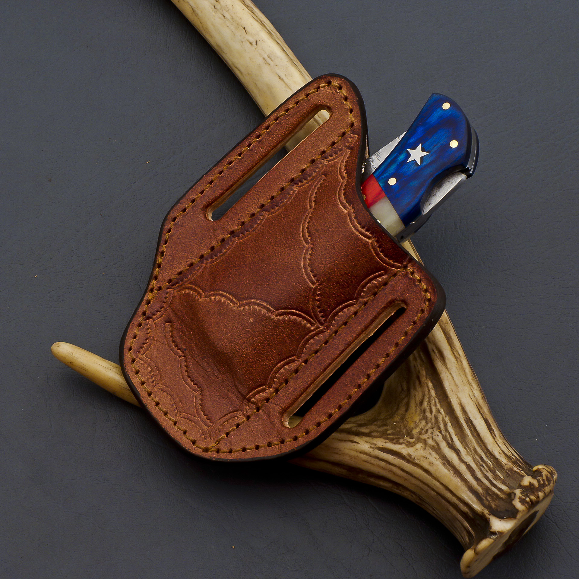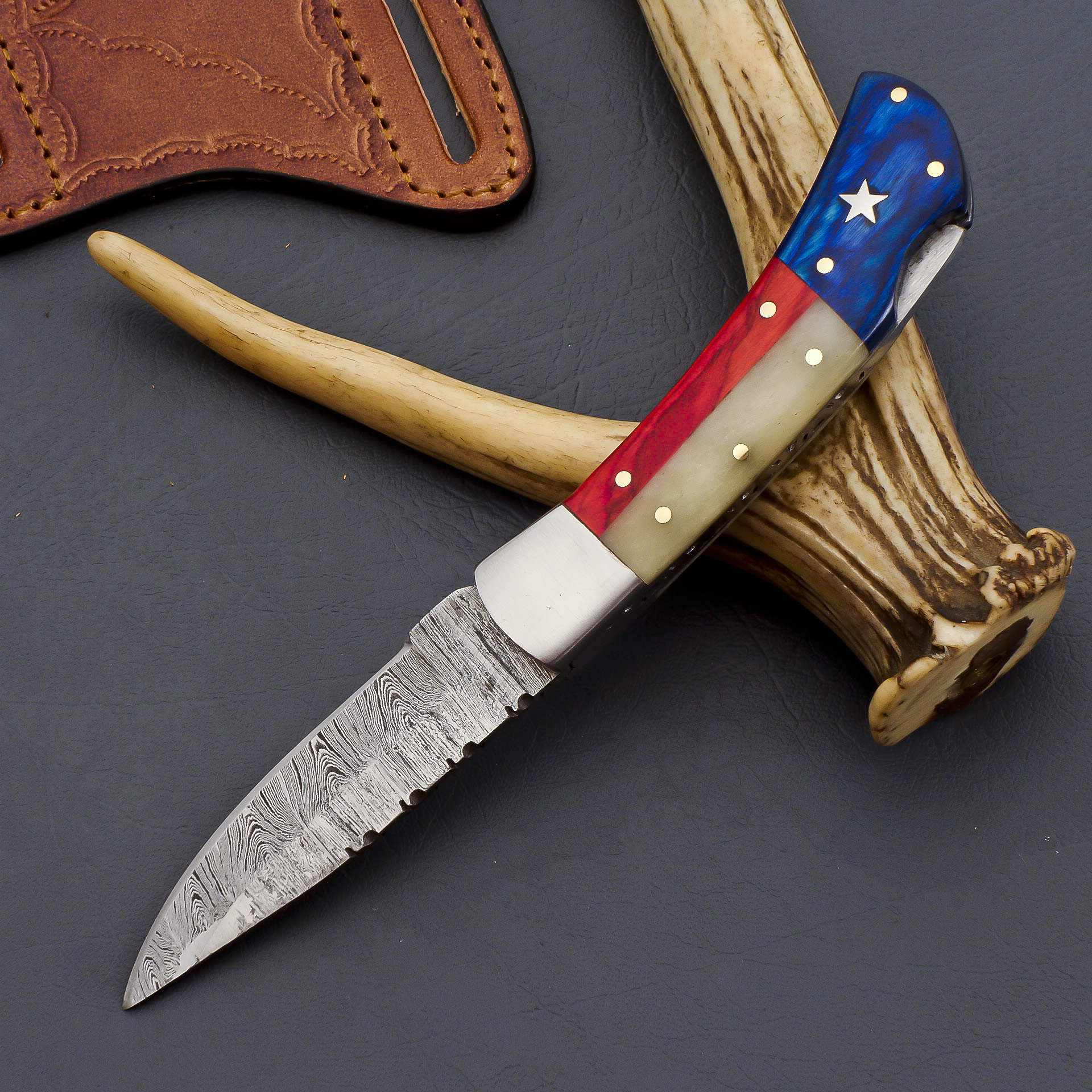 This Damascus steel folding knife blends practicality with striking design. With an open length of 7.5″ and a compact closed size of 4.25″, it’s perfect for everyday carry while showcasing artisan detail. The handle is crafted in a Texas flag motif, combining blue and red pakkawood with white bone for a bold, patriotic look. A finely patterned Damascus blade ensures strength and cutting precision, while the folding mechanism adds convenience and portability. Complete with a hand-stitched leather sheath, this knife is both functional and collectible.