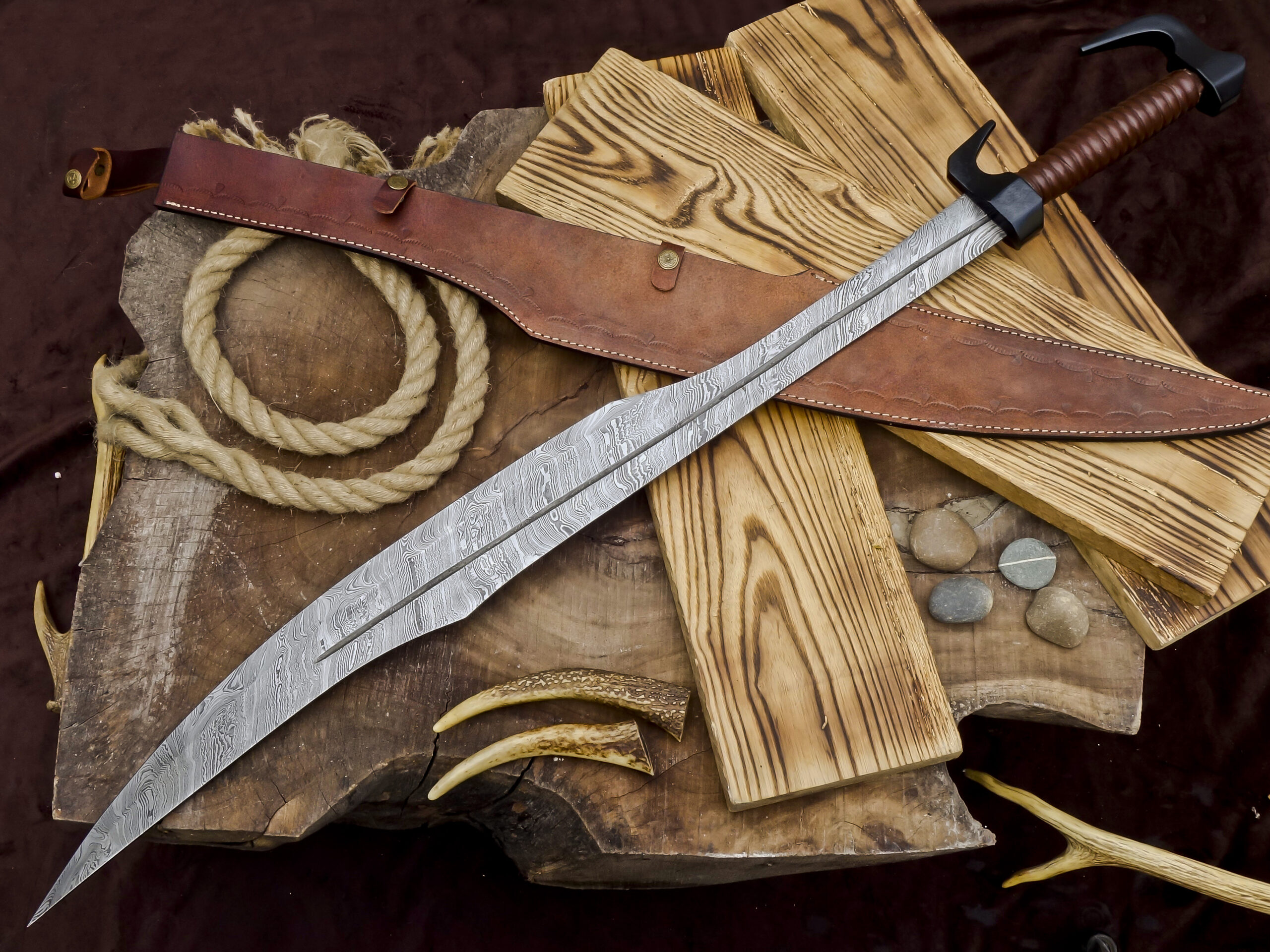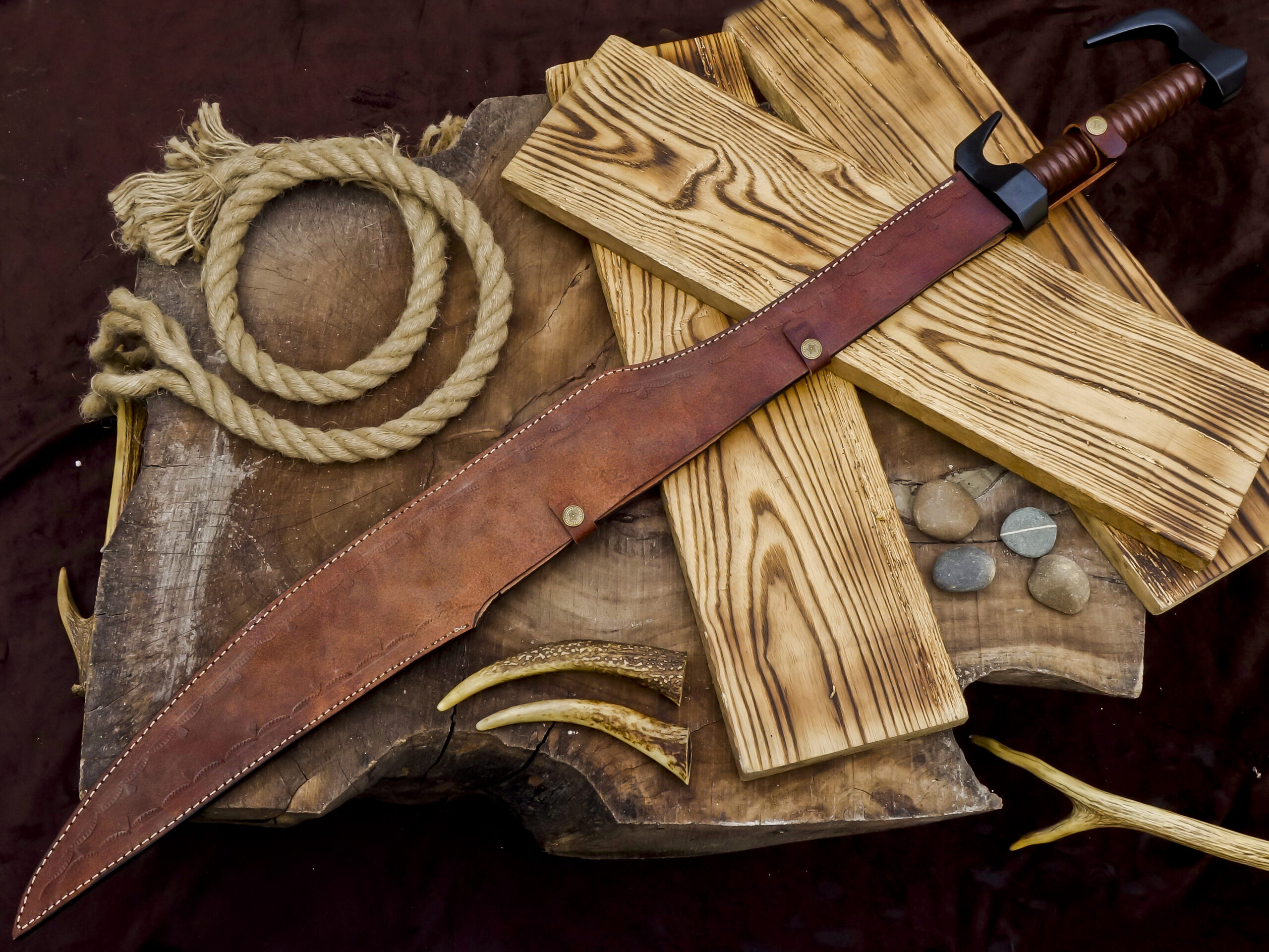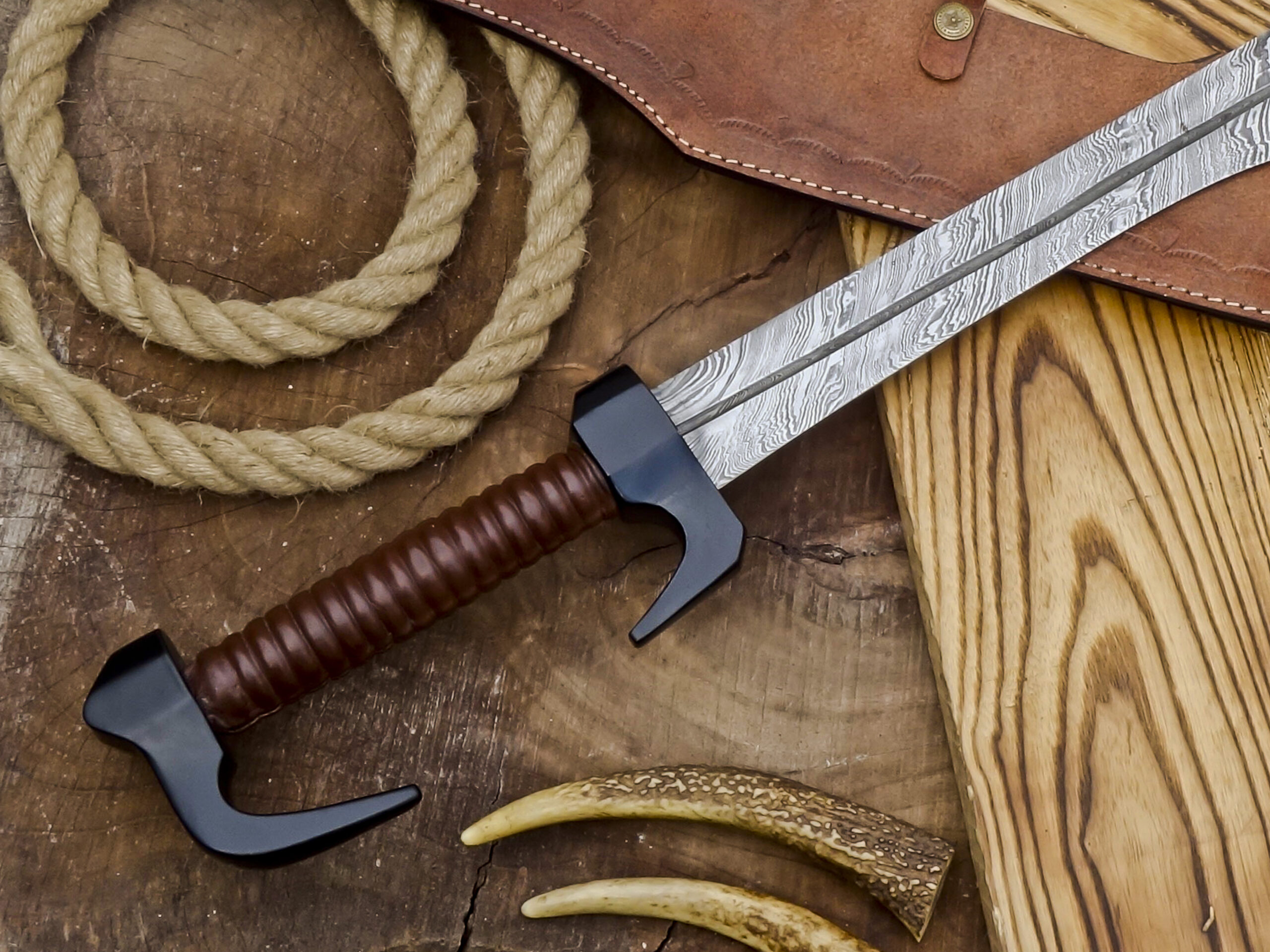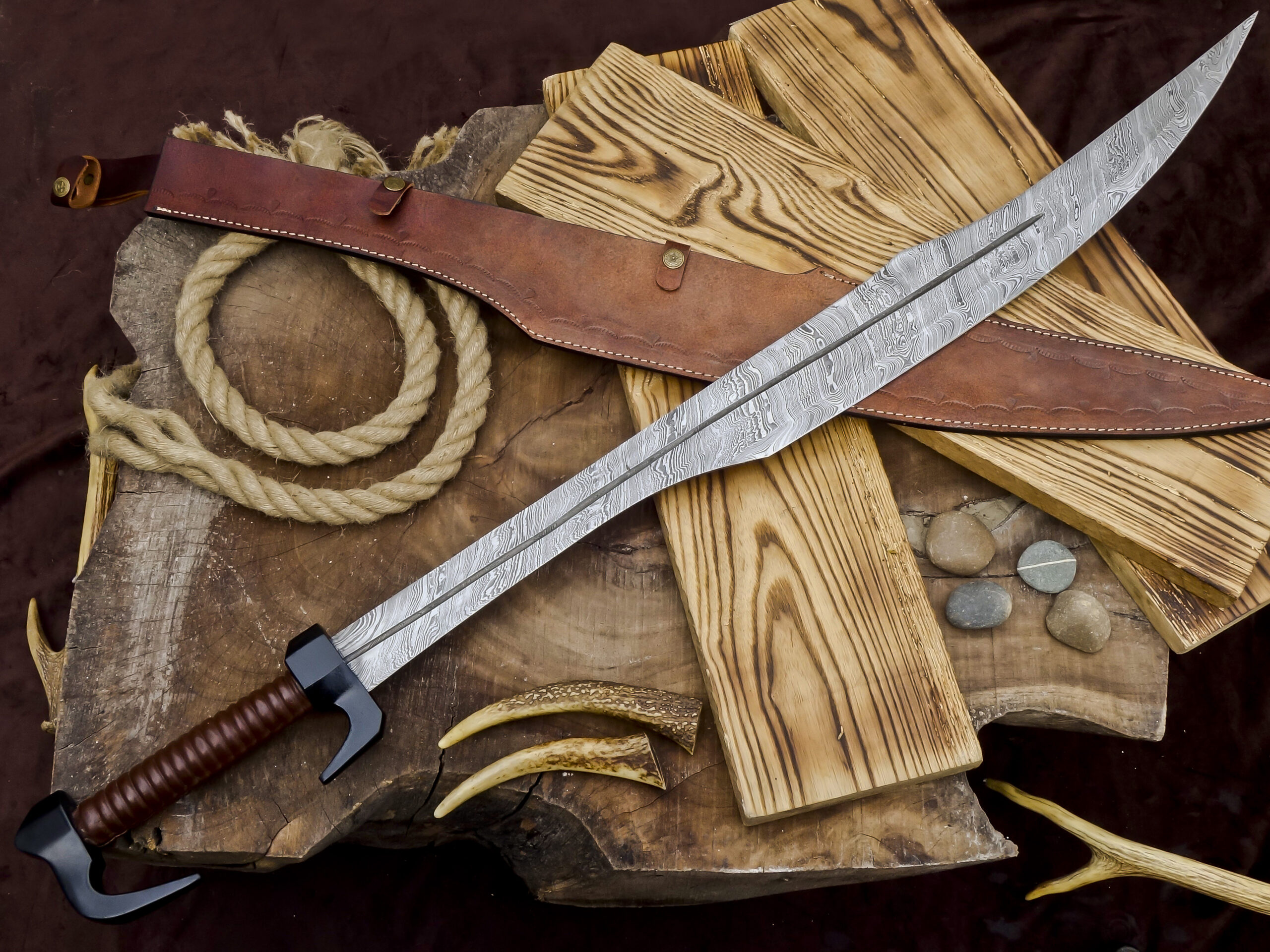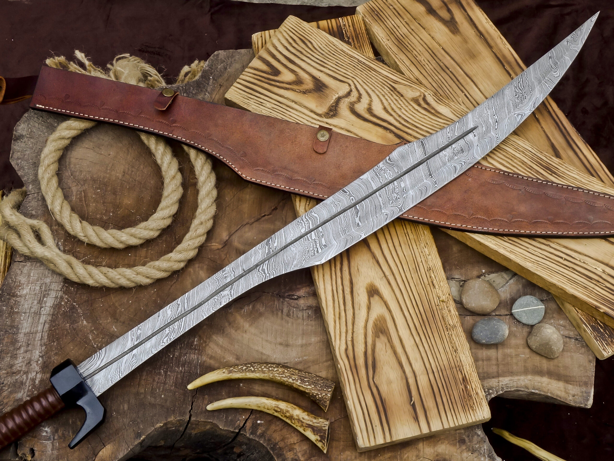 The handle is wrapped in durable leather, providing a comfortable and secure grip. The sword comes with a premium handmade leather sheath, designed to protect the blade while adding to its traditional, rustic character.
